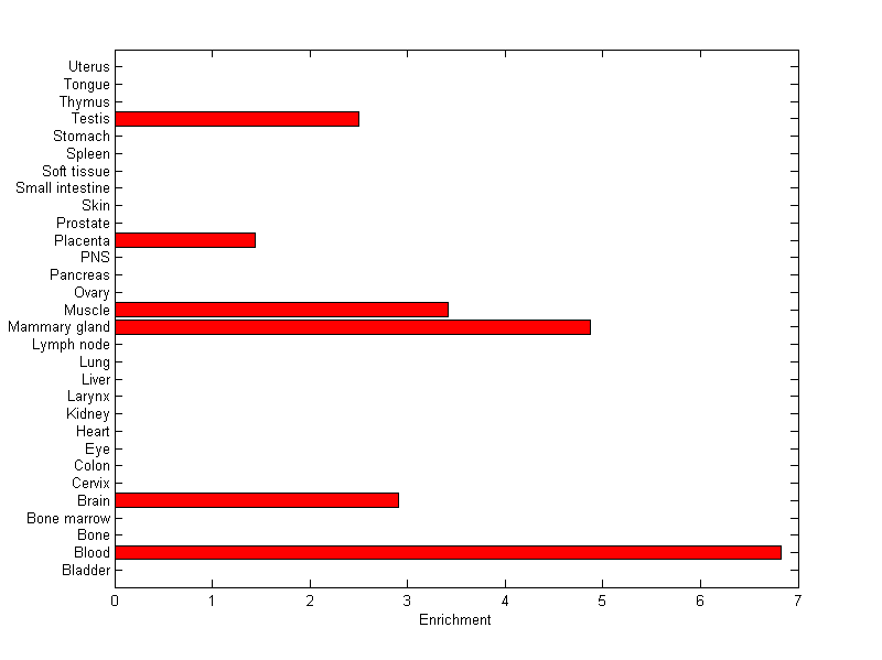 The expression level is normalized with tissue-library size. Each value for a gene in a tissue is a ratio of observed ESTs to the expected one in this tissue. The expected number of ESTs is the product of total ESTs of the gene and the fraction of total ESTs in the tissue among all ESTs in 30 tissues.