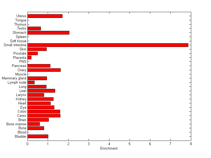 The expression level is normalized with tissue-library size. Each value for a gene in a tissue is a ratio of observed ESTs to the expected one in this tissue. The expected number of ESTs is the product of total ESTs of the gene and the fraction of total ESTs in the tissue among all ESTs in 30 tissues.