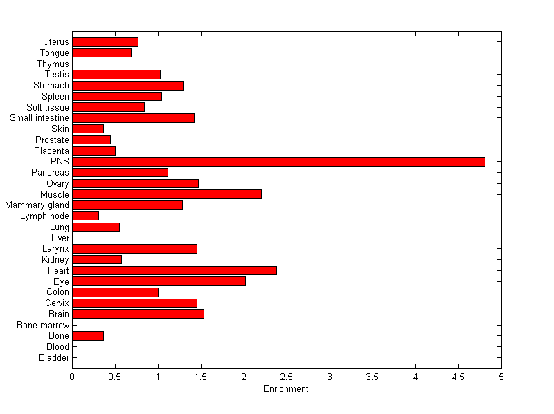 The expression level is normalized with tissue-library size. Each value for a gene in a tissue is a ratio of observed ESTs to the expected one in this tissue. The expected number of ESTs is the product of total ESTs of the gene and the fraction of total ESTs in the tissue among all ESTs in 30 tissues.