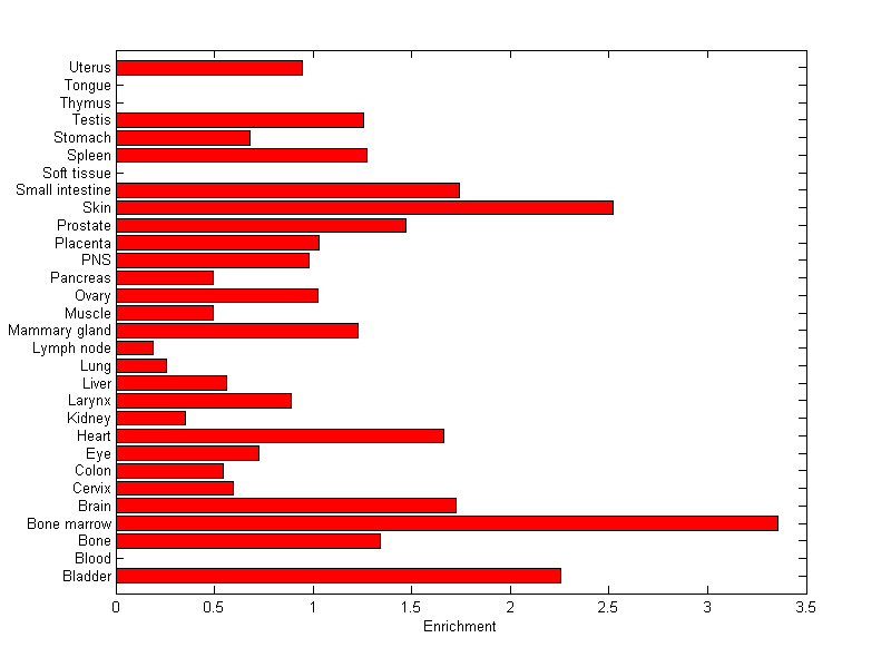The expression level is normalized with tissue-library size. Each value for a gene in a tissue is a ratio of observed ESTs to the expected one in this tissue. The expected number of ESTs is the product of total ESTs of the gene and the fraction of total ESTs in the tissue among all ESTs in 30 tissues.