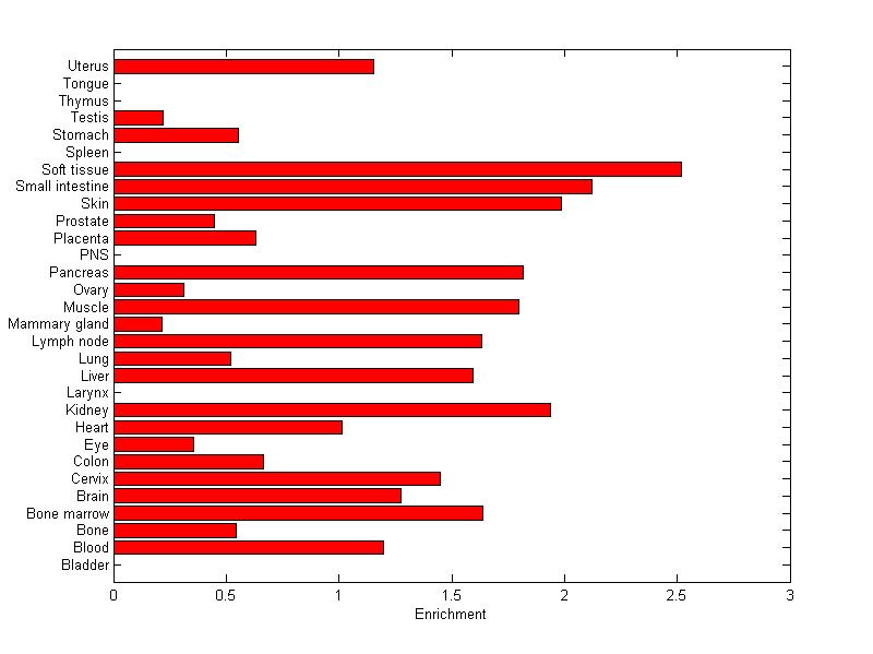 The expression level is normalized with tissue-library size. Each value for a gene in a tissue is a ratio of observed ESTs to the expected one in this tissue. The expected number of ESTs is the product of total ESTs of the gene and the fraction of total ESTs in the tissue among all ESTs in 30 tissues.