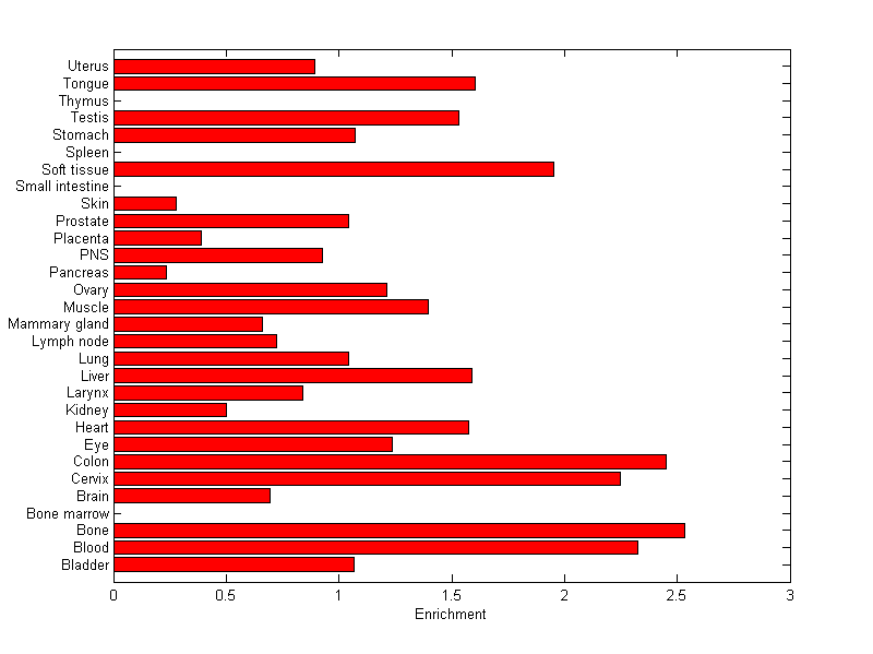 The expression level is normalized with tissue-library size. Each value for a gene in a tissue is a ratio of observed ESTs to the expected one in this tissue. The expected number of ESTs is the product of total ESTs of the gene and the fraction of total ESTs in the tissue among all ESTs in 30 tissues.