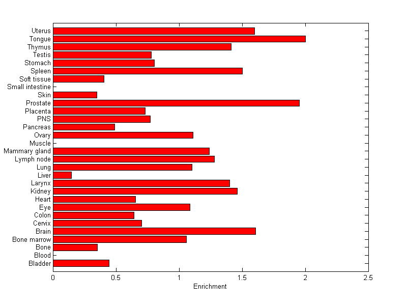 The expression level is normalized with tissue-library size. Each value for a gene in a tissue is a ratio of observed ESTs to the expected one in this tissue. The expected number of ESTs is the product of total ESTs of the gene and the fraction of total ESTs in the tissue among all ESTs in 30 tissues.