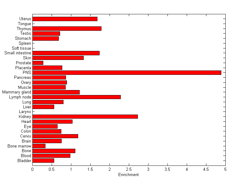 The expression level is normalized with tissue-library size. Each value for a gene in a tissue is a ratio of observed ESTs to the expected one in this tissue. The expected number of ESTs is the product of total ESTs of the gene and the fraction of total ESTs in the tissue among all ESTs in 30 tissues.