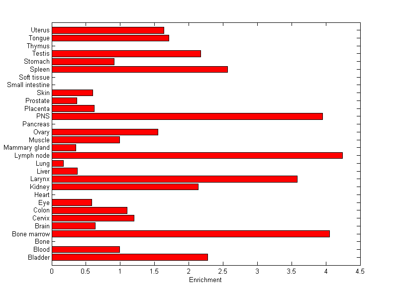 The expression level is normalized with tissue-library size. Each value for a gene in a tissue is a ratio of observed ESTs to the expected one in this tissue. The expected number of ESTs is the product of total ESTs of the gene and the fraction of total ESTs in the tissue among all ESTs in 30 tissues.