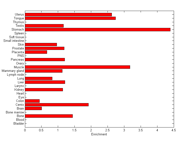 The expression level is normalized with tissue-library size. Each value for a gene in a tissue is a ratio of observed ESTs to the expected one in this tissue. The expected number of ESTs is the product of total ESTs of the gene and the fraction of total ESTs in the tissue among all ESTs in 30 tissues.