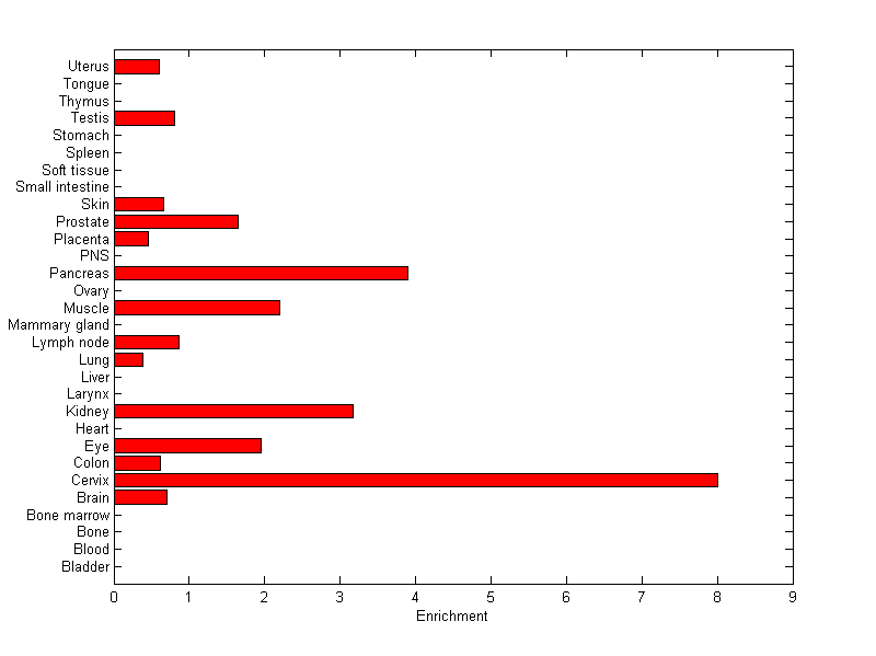The expression level is normalized with tissue-library size. Each value for a gene in a tissue is a ratio of observed ESTs to the expected one in this tissue. The expected number of ESTs is the product of total ESTs of the gene and the fraction of total ESTs in the tissue among all ESTs in 30 tissues.
