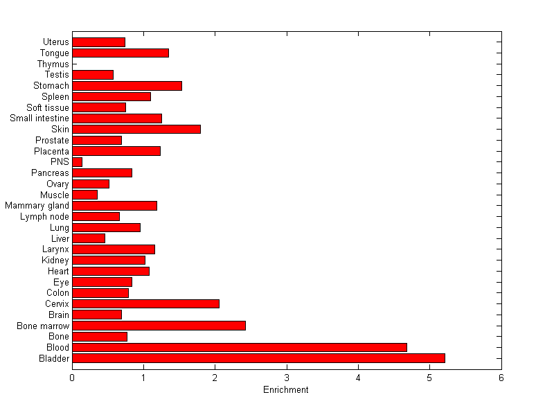 The expression level is normalized with tissue-library size. Each value for a gene in a tissue is a ratio of observed ESTs to the expected one in this tissue. The expected number of ESTs is the product of total ESTs of the gene and the fraction of total ESTs in the tissue among all ESTs in 30 tissues.