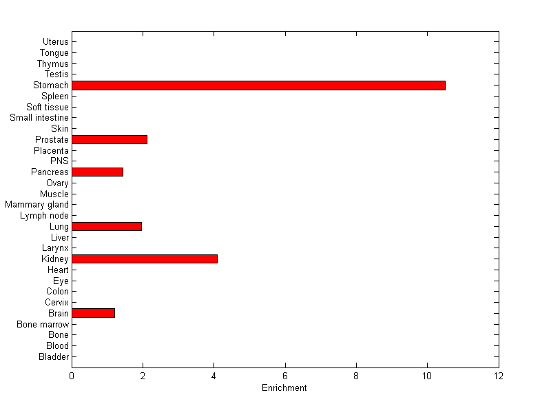The expression level is normalized with tissue-library size. Each value for a gene in a tissue is a ratio of observed ESTs to the expected one in this tissue. The expected number of ESTs is the product of total ESTs of the gene and the fraction of total ESTs in the tissue among all ESTs in 30 tissues.