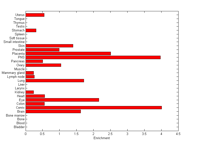 The expression level is normalized with tissue-library size. Each value for a gene in a tissue is a ratio of observed ESTs to the expected one in this tissue. The expected number of ESTs is the product of total ESTs of the gene and the fraction of total ESTs in the tissue among all ESTs in 30 tissues.