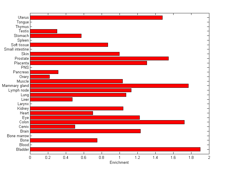 The expression level is normalized with tissue-library size. Each value for a gene in a tissue is a ratio of observed ESTs to the expected one in this tissue. The expected number of ESTs is the product of total ESTs of the gene and the fraction of total ESTs in the tissue among all ESTs in 30 tissues.