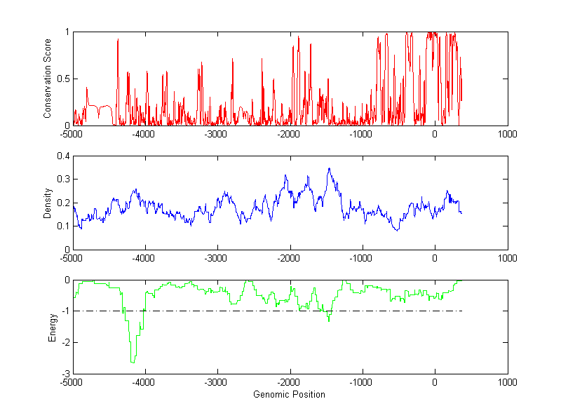 About the profiles: The conservation profile (red curve) is about conservation scores of the promoter sequences. Conservation was determined from an eight-way alignment of human, chimpanzee, dog, mouse, rat, chicken, zebrafish and fugu sequences. The conservation was quantified by a conservation score between 0 and 1, with 1 as highest conservation. The conservation score was obtained from UCSC genome databases. The density profile (blue curve) is about density of all TF binding sites. The energy profile (green curve) is about energy for module detection based on TF interaction. The positions with energy less than -1 indicate the existence of CRMs. Download: Conservation profileDensity profile Energy profile CRM summary |