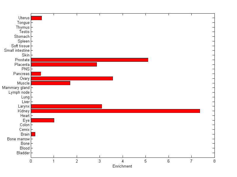 About the profile: The expression level is normalized with tissue-library size. Each value for a gene in a tissue is a ratio of observed ESTs to the expected one in this tissue. The expected number of ESTs is the product of total ESTs of the gene and the fraction of total ESTs in the tissue among all ESTs in 30 tissues. Summary: This gene is preferentially expressed in [kidney, prostate] Download: |