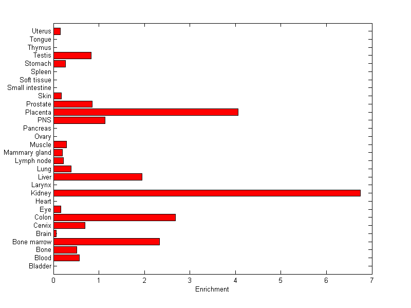 About the profile: The expression level is normalized with tissue-library size. Each value for a gene in a tissue is a ratio of observed ESTs to the expected one in this tissue. The expected number of ESTs is the product of total ESTs of the gene and the fraction of total ESTs in the tissue among all ESTs in 30 tissues. Summary: This gene is preferentially expressed in [kidney] Download: |