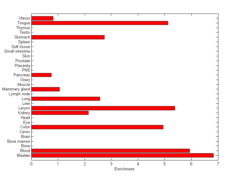 The expression level is normalized with tissue-library size. Each value for a gene in a tissue is a ratio of observed ESTs to the expected one in this tissue. The expected number of ESTs is the product of total ESTs of the gene and the fraction of total ESTs in the tissue among all ESTs in 30 tissues.