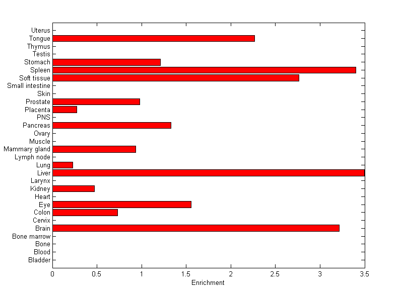 The expression level is normalized with tissue-library size. Each value for a gene in a tissue is a ratio of observed ESTs to the expected one in this tissue. The expected number of ESTs is the product of total ESTs of the gene and the fraction of total ESTs in the tissue among all ESTs in 30 tissues.