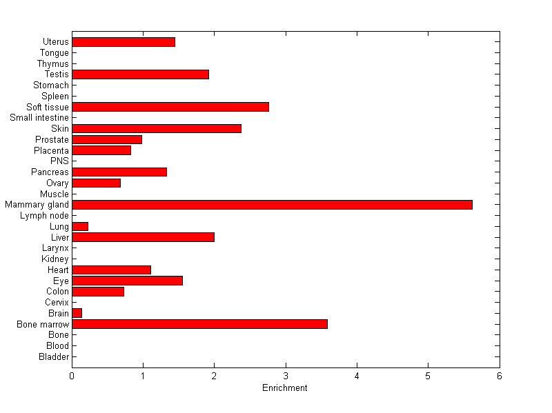 The expression level is normalized with tissue-library size. Each value for a gene in a tissue is a ratio of observed ESTs to the expected one in this tissue. The expected number of ESTs is the product of total ESTs of the gene and the fraction of total ESTs in the tissue among all ESTs in 30 tissues.