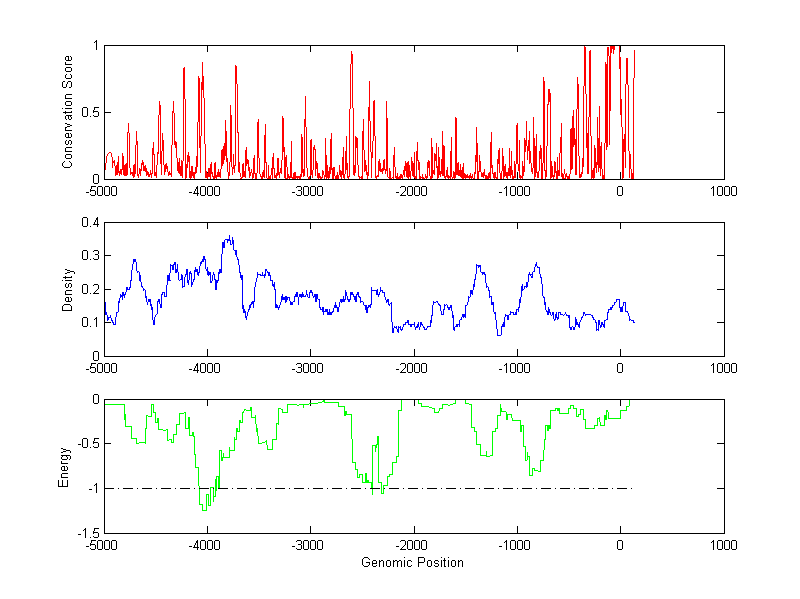 The energy profile (green curve) is about energy for module detection based on TF interaction. The positions with energy less than -1 indicate the existence of CRMs.