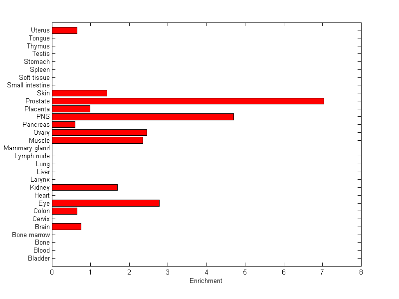 The expression level is normalized with tissue-library size. Each value for a gene in a tissue is a ratio of observed ESTs to the expected one in this tissue. The expected number of ESTs is the product of total ESTs of the gene and the fraction of total ESTs in the tissue among all ESTs in 30 tissues.