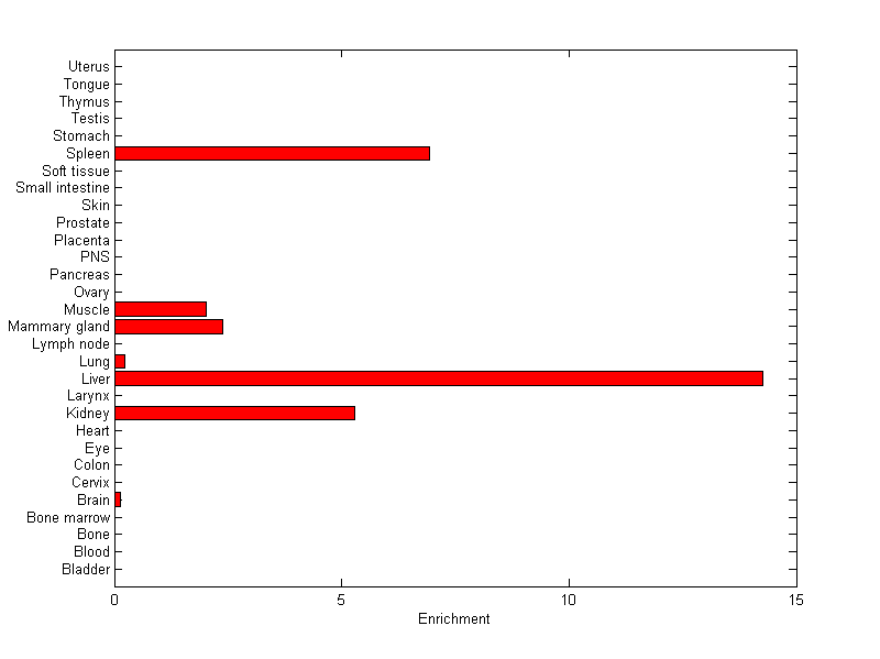 The expression level is normalized with tissue-library size. Each value for a gene in a tissue is a ratio of observed ESTs to the expected one in this tissue. The expected number of ESTs is the product of total ESTs of the gene and the fraction of total ESTs in the tissue among all ESTs in 30 tissues.