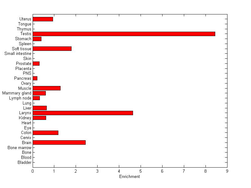 The expression level is normalized with tissue-library size. Each value for a gene in a tissue is a ratio of observed ESTs to the expected one in this tissue. The expected number of ESTs is the product of total ESTs of the gene and the fraction of total ESTs in the tissue among all ESTs in 30 tissues.