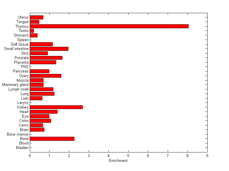 The expression level is normalized with tissue-library size. Each value for a gene in a tissue is a ratio of observed ESTs to the expected one in this tissue. The expected number of ESTs is the product of total ESTs of the gene and the fraction of total ESTs in the tissue among all ESTs in 30 tissues.