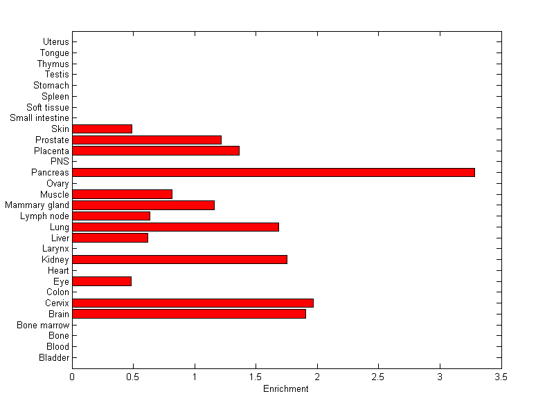 The expression level is normalized with tissue-library size. Each value for a gene in a tissue is a ratio of observed ESTs to the expected one in this tissue. The expected number of ESTs is the product of total ESTs of the gene and the fraction of total ESTs in the tissue among all ESTs in 30 tissues.