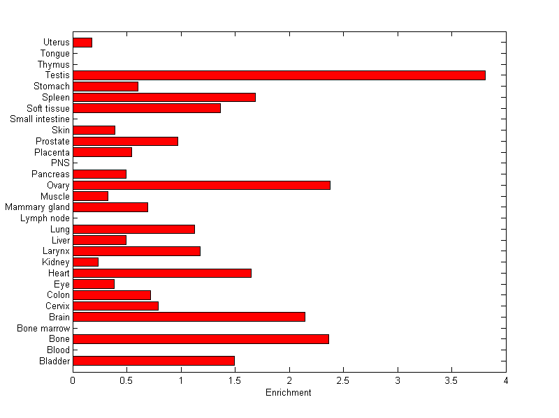 The expression level is normalized with tissue-library size. Each value for a gene in a tissue is a ratio of observed ESTs to the expected one in this tissue. The expected number of ESTs is the product of total ESTs of the gene and the fraction of total ESTs in the tissue among all ESTs in 30 tissues.