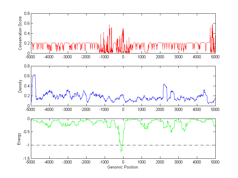The energy profile (green curve) is about energy for module detection based on TF interaction. The positions with energy less than -1 indicate the existence of CRMs.