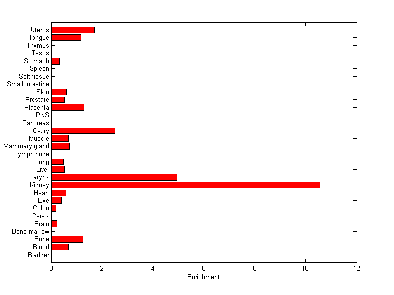 The expression level is normalized with tissue-library size. Each value for a gene in a tissue is a ratio of observed ESTs to the expected one in this tissue. The expected number of ESTs is the product of total ESTs of the gene and the fraction of total ESTs in the tissue among all ESTs in 30 tissues.