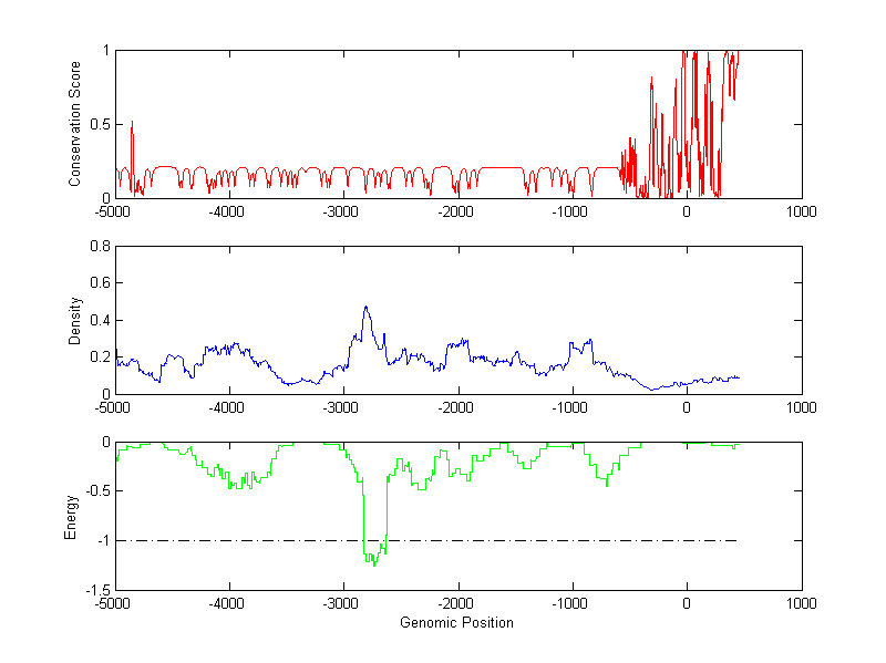 About the profiles: The conservation profile (red curve) is about conservation scores of the promoter sequences. Conservation was determined from an eight-way alignment of human, chimpanzee, dog, mouse, rat, chicken, zebrafish and fugu sequences. The conservation was quantified by a conservation score between 0 and 1, with 1 as highest conservation. The conservation score was obtained from UCSC genome databases. The density profile (blue curve) is about density of all TF binding sites. The energy profile (green curve) is about energy for module detection based on TF interaction. The positions with energy less than -1 indicate the existence of CRMs. Download: Conservation profileDensity profile Energy profile CRM summary |