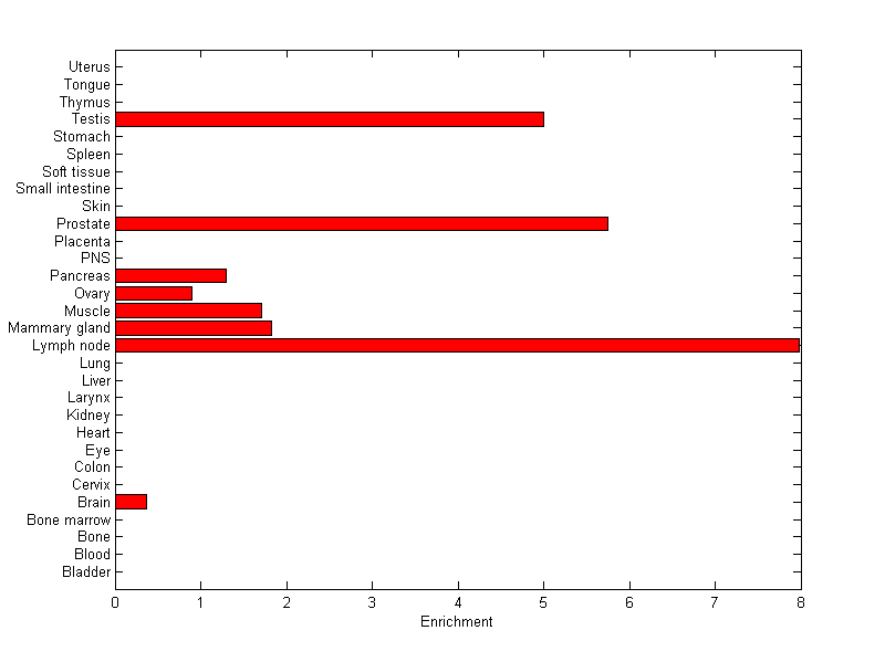 About the profile: The expression level is normalized with tissue-library size. Each value for a gene in a tissue is a ratio of observed ESTs to the expected one in this tissue. The expected number of ESTs is the product of total ESTs of the gene and the fraction of total ESTs in the tissue among all ESTs in 30 tissues. Summary: This gene is preferentially expressed in [lymph_node, prostate] Download: |