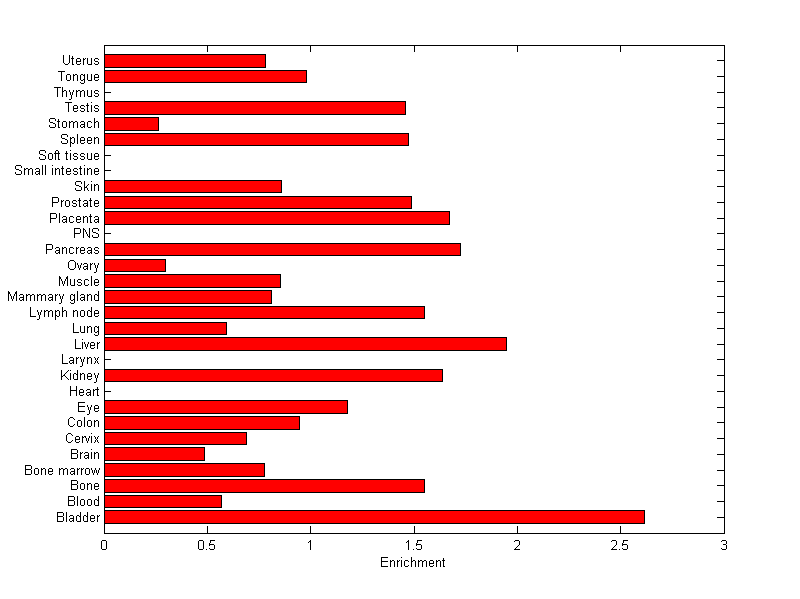 The expression level is normalized with tissue-library size. Each value for a gene in a tissue is a ratio of observed ESTs to the expected one in this tissue. The expected number of ESTs is the product of total ESTs of the gene and the fraction of total ESTs in the tissue among all ESTs in 30 tissues.
