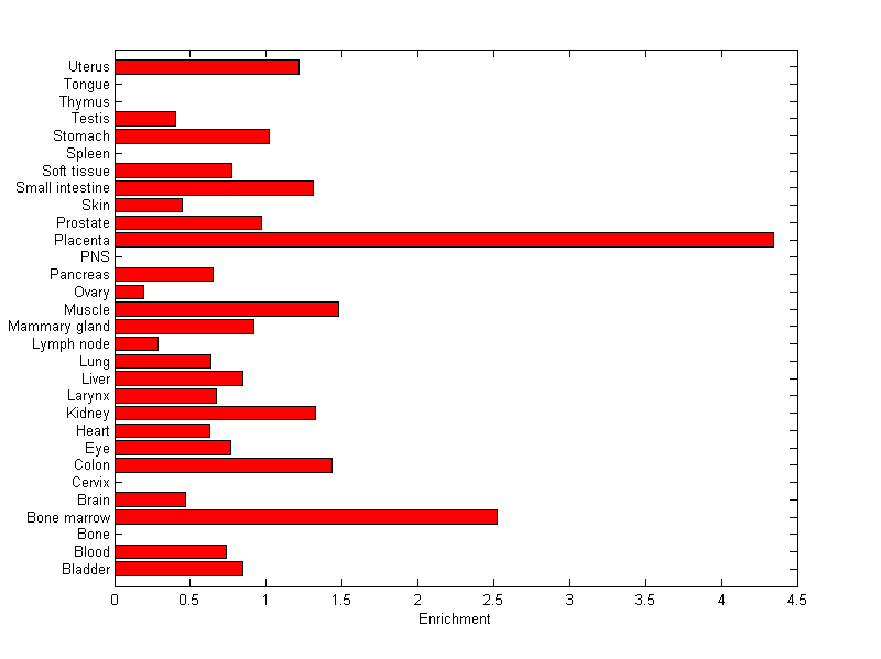 The expression level is normalized with tissue-library size. Each value for a gene in a tissue is a ratio of observed ESTs to the expected one in this tissue. The expected number of ESTs is the product of total ESTs of the gene and the fraction of total ESTs in the tissue among all ESTs in 30 tissues.