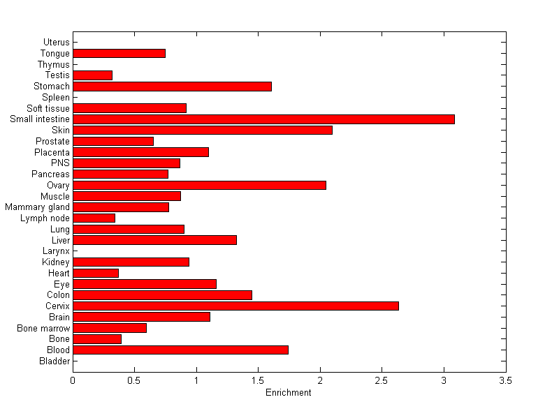 The expression level is normalized with tissue-library size. Each value for a gene in a tissue is a ratio of observed ESTs to the expected one in this tissue. The expected number of ESTs is the product of total ESTs of the gene and the fraction of total ESTs in the tissue among all ESTs in 30 tissues.