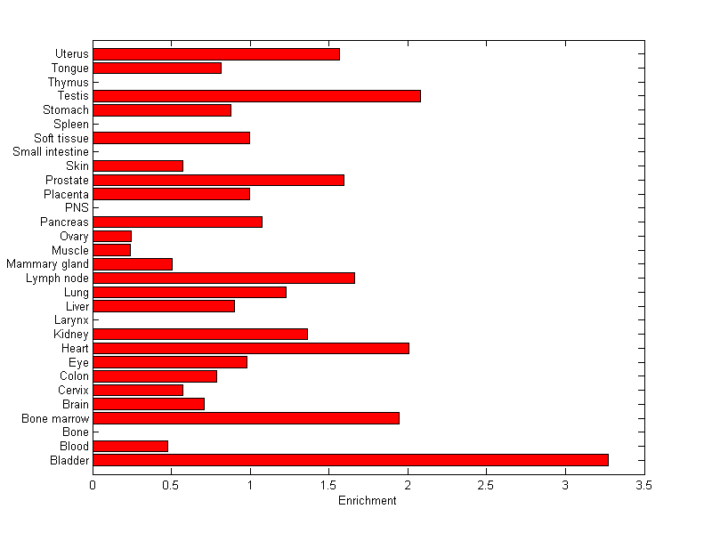 The expression level is normalized with tissue-library size. Each value for a gene in a tissue is a ratio of observed ESTs to the expected one in this tissue. The expected number of ESTs is the product of total ESTs of the gene and the fraction of total ESTs in the tissue among all ESTs in 30 tissues.