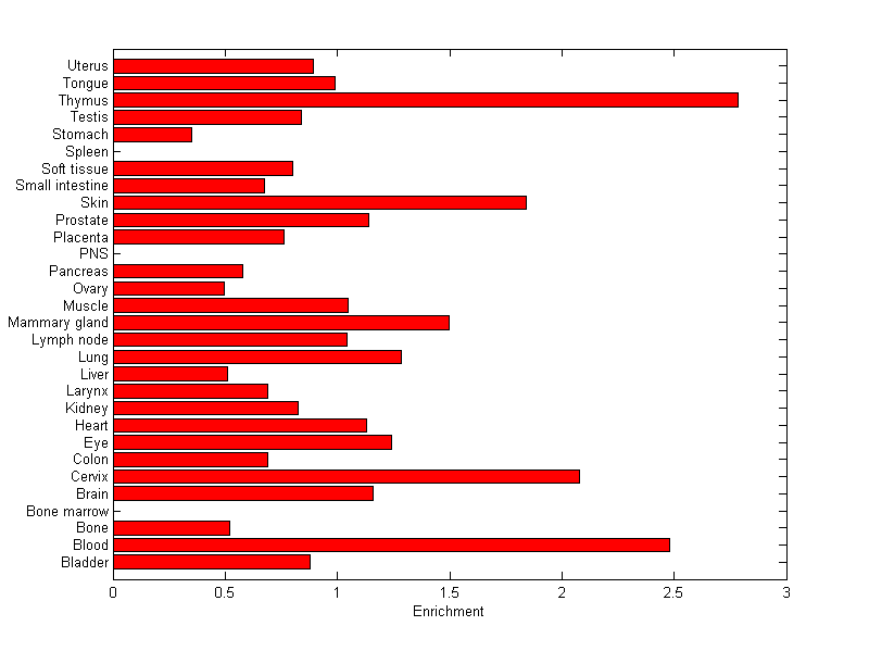 The expression level is normalized with tissue-library size. Each value for a gene in a tissue is a ratio of observed ESTs to the expected one in this tissue. The expected number of ESTs is the product of total ESTs of the gene and the fraction of total ESTs in the tissue among all ESTs in 30 tissues.
