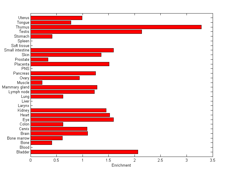 The expression level is normalized with tissue-library size. Each value for a gene in a tissue is a ratio of observed ESTs to the expected one in this tissue. The expected number of ESTs is the product of total ESTs of the gene and the fraction of total ESTs in the tissue among all ESTs in 30 tissues.