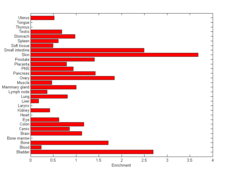 The expression level is normalized with tissue-library size. Each value for a gene in a tissue is a ratio of observed ESTs to the expected one in this tissue. The expected number of ESTs is the product of total ESTs of the gene and the fraction of total ESTs in the tissue among all ESTs in 30 tissues.
