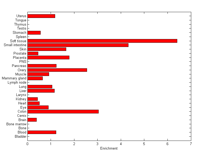 The expression level is normalized with tissue-library size. Each value for a gene in a tissue is a ratio of observed ESTs to the expected one in this tissue. The expected number of ESTs is the product of total ESTs of the gene and the fraction of total ESTs in the tissue among all ESTs in 30 tissues.
