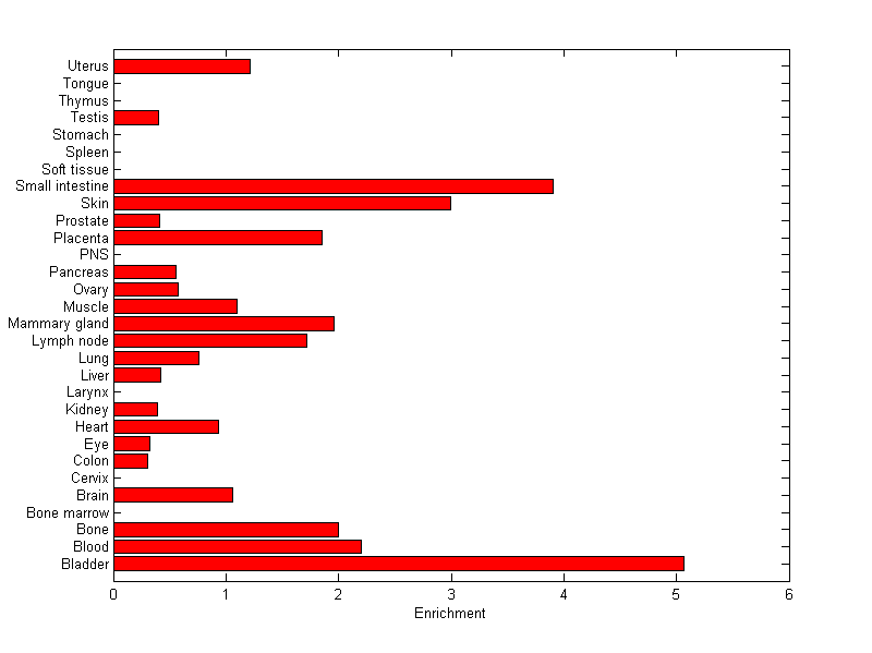 The expression level is normalized with tissue-library size. Each value for a gene in a tissue is a ratio of observed ESTs to the expected one in this tissue. The expected number of ESTs is the product of total ESTs of the gene and the fraction of total ESTs in the tissue among all ESTs in 30 tissues.