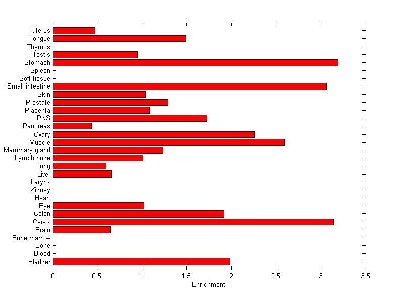 The expression level is normalized with tissue-library size. Each value for a gene in a tissue is a ratio of observed ESTs to the expected one in this tissue. The expected number of ESTs is the product of total ESTs of the gene and the fraction of total ESTs in the tissue among all ESTs in 30 tissues.