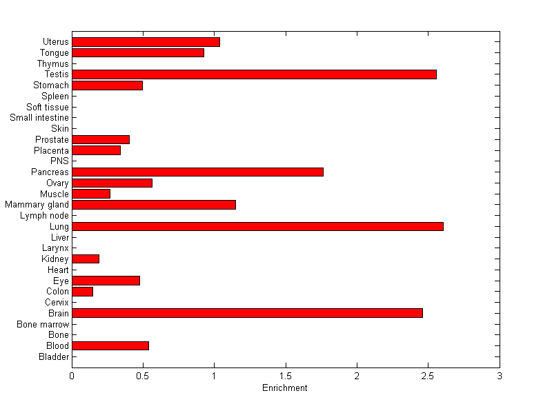 The expression level is normalized with tissue-library size. Each value for a gene in a tissue is a ratio of observed ESTs to the expected one in this tissue. The expected number of ESTs is the product of total ESTs of the gene and the fraction of total ESTs in the tissue among all ESTs in 30 tissues.