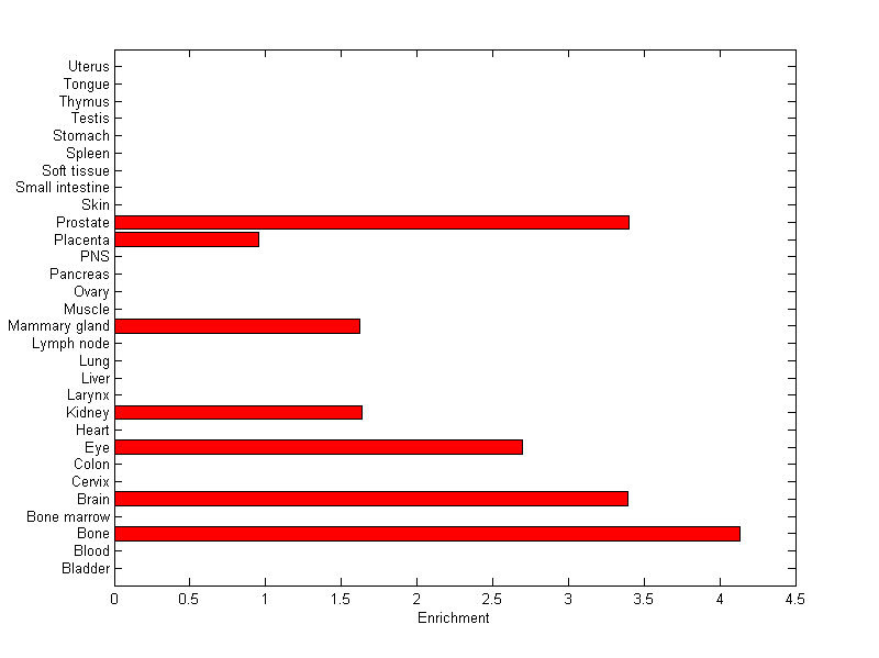 The expression level is normalized with tissue-library size. Each value for a gene in a tissue is a ratio of observed ESTs to the expected one in this tissue. The expected number of ESTs is the product of total ESTs of the gene and the fraction of total ESTs in the tissue among all ESTs in 30 tissues.