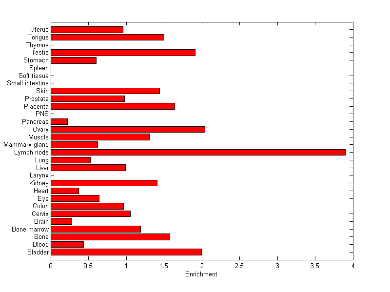 The expression level is normalized with tissue-library size. Each value for a gene in a tissue is a ratio of observed ESTs to the expected one in this tissue. The expected number of ESTs is the product of total ESTs of the gene and the fraction of total ESTs in the tissue among all ESTs in 30 tissues.