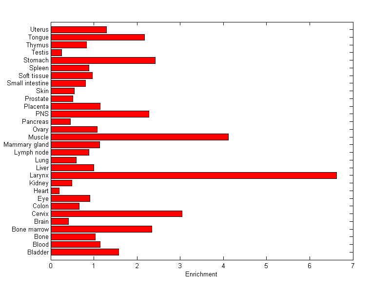 The expression level is normalized with tissue-library size. Each value for a gene in a tissue is a ratio of observed ESTs to the expected one in this tissue. The expected number of ESTs is the product of total ESTs of the gene and the fraction of total ESTs in the tissue among all ESTs in 30 tissues.
