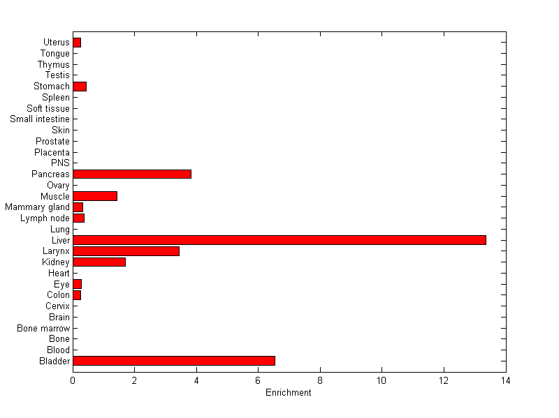 The expression level is normalized with tissue-library size. Each value for a gene in a tissue is a ratio of observed ESTs to the expected one in this tissue. The expected number of ESTs is the product of total ESTs of the gene and the fraction of total ESTs in the tissue among all ESTs in 30 tissues.