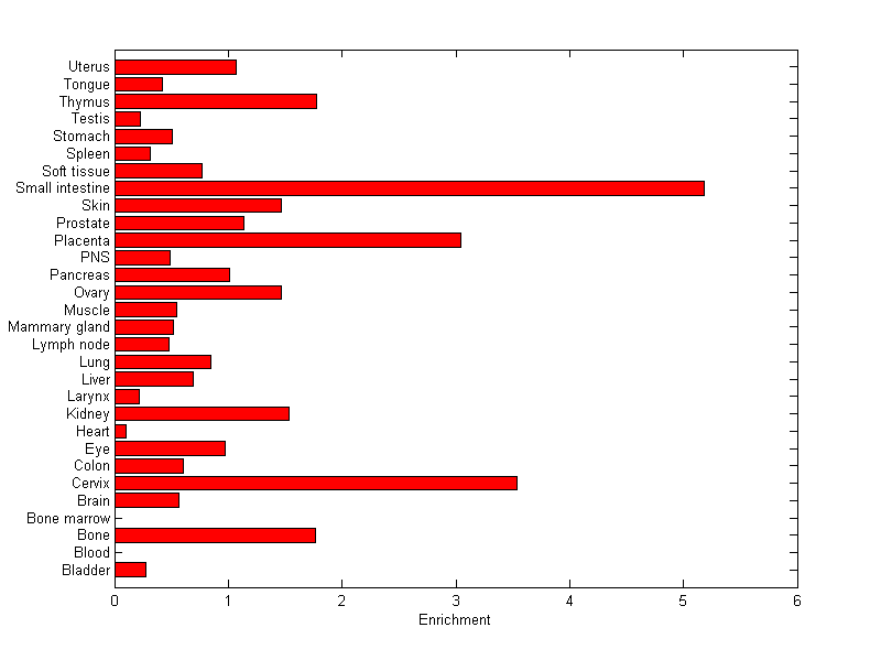 The expression level is normalized with tissue-library size. Each value for a gene in a tissue is a ratio of observed ESTs to the expected one in this tissue. The expected number of ESTs is the product of total ESTs of the gene and the fraction of total ESTs in the tissue among all ESTs in 30 tissues.