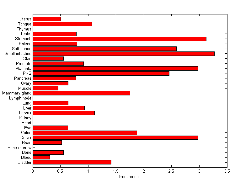 The expression level is normalized with tissue-library size. Each value for a gene in a tissue is a ratio of observed ESTs to the expected one in this tissue. The expected number of ESTs is the product of total ESTs of the gene and the fraction of total ESTs in the tissue among all ESTs in 30 tissues.