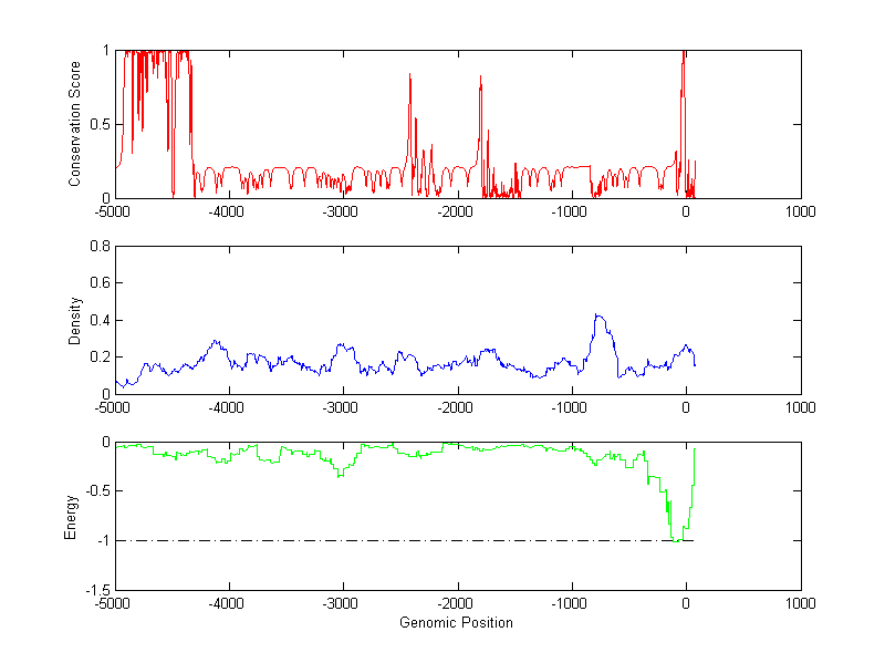 The energy profile (green curve) is about energy for module detection based on TF interaction. The positions with energy less than -1 indicate the existence of CRMs.